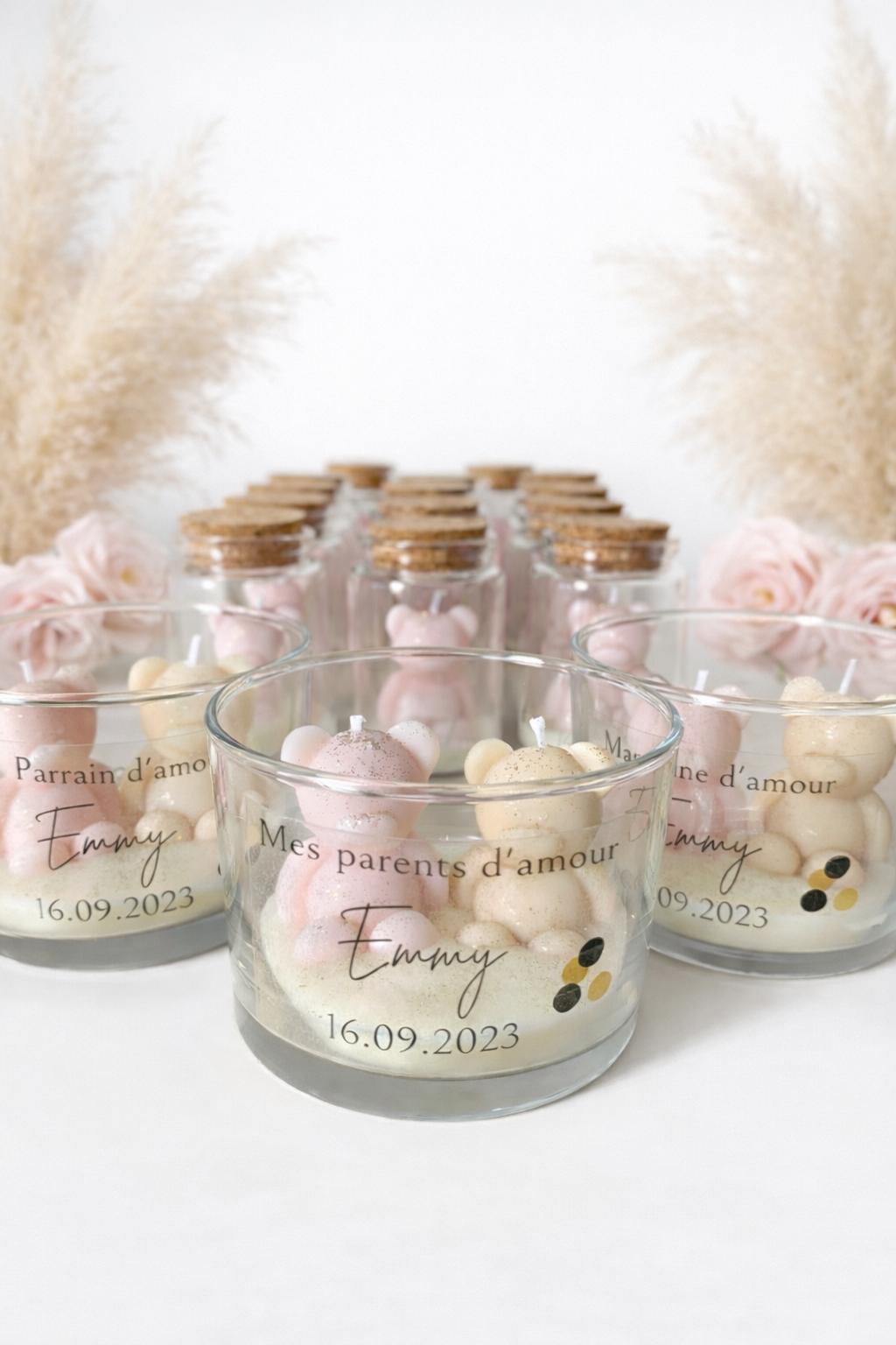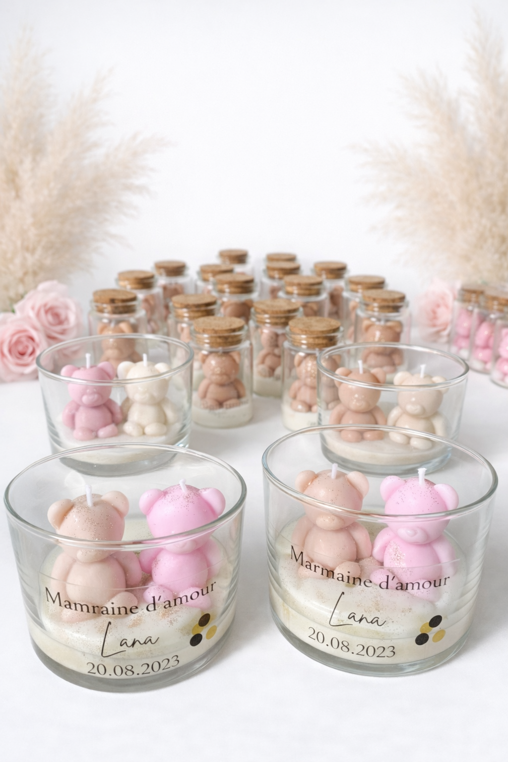Chaque bougie renferme 2 adorables oursons, délicatement disposés pour un rendu à la fois doux, original et plein d’émotion.